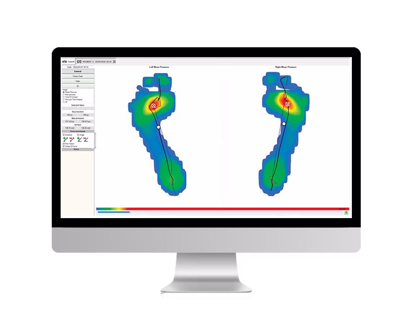 Le premier permet au podologue de confirmer son analyse des zones d’hypo- et d’hyper-appuis lorsque le patient se tient debout, immobile, en position de référence.